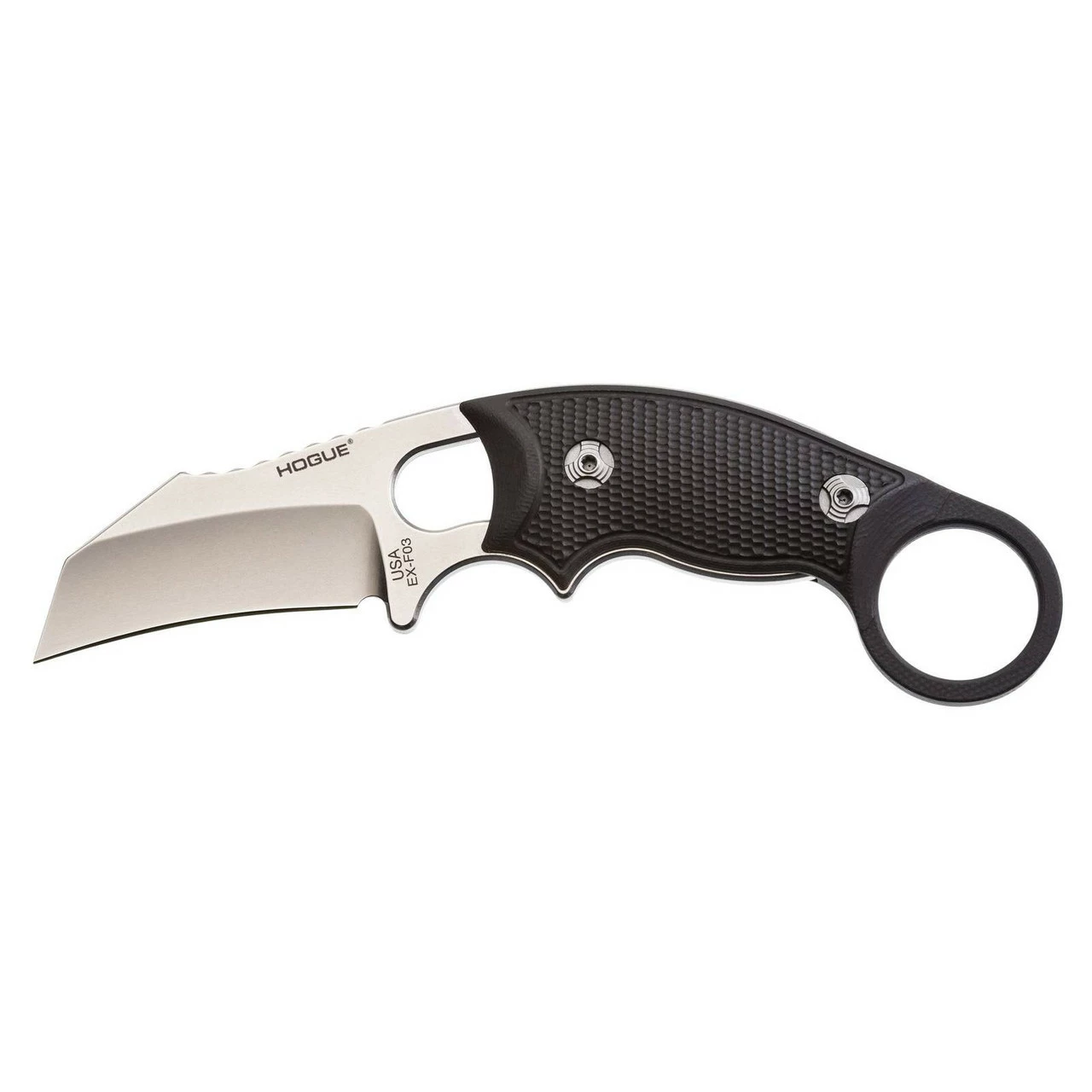 Using the skeletonized EX-F03 platform as the base, this Hawkbill Karambit from Hogue Knives features a contoured and textured black G-10 handle with finger ring for increased grip and utility. The EX-F03 is an Allen Elishewitz design and every detail of this fixed blade has been thoroughly thought out. The wide handle profile offers additional grip that a thinner design lacks. Two blade styles are available: clip point and hawkbill. An auto retention sheath is included with this EX-F03 knife.