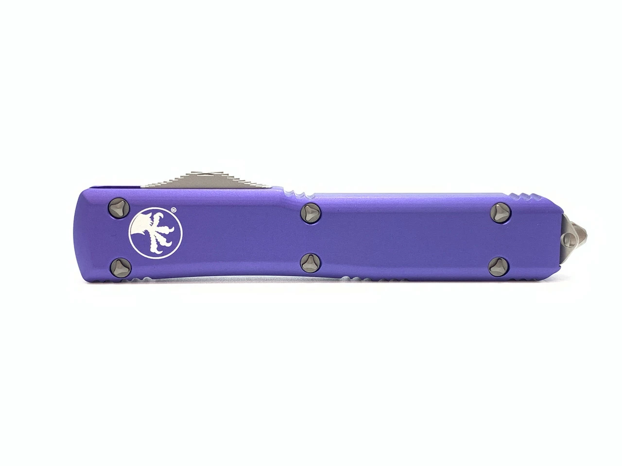 As the flagship model of the Microtech OTF lineup, the Ultratech sets the standard for Out-The-Front technology. Proprietary design allows the firing spring to be at rest in both the open and closed positions, drastically reducing wear on the internal firing mechanisms. The contoured chassis handle provides a lighter and more ergonomic feel and comes in a smooth, flat finish. This Ultratech is equipped with a double-edge dagger blade with a stonewashed finish and Purple aluminum handles. Hardware and pocket clip also feature a stonewashed finish.