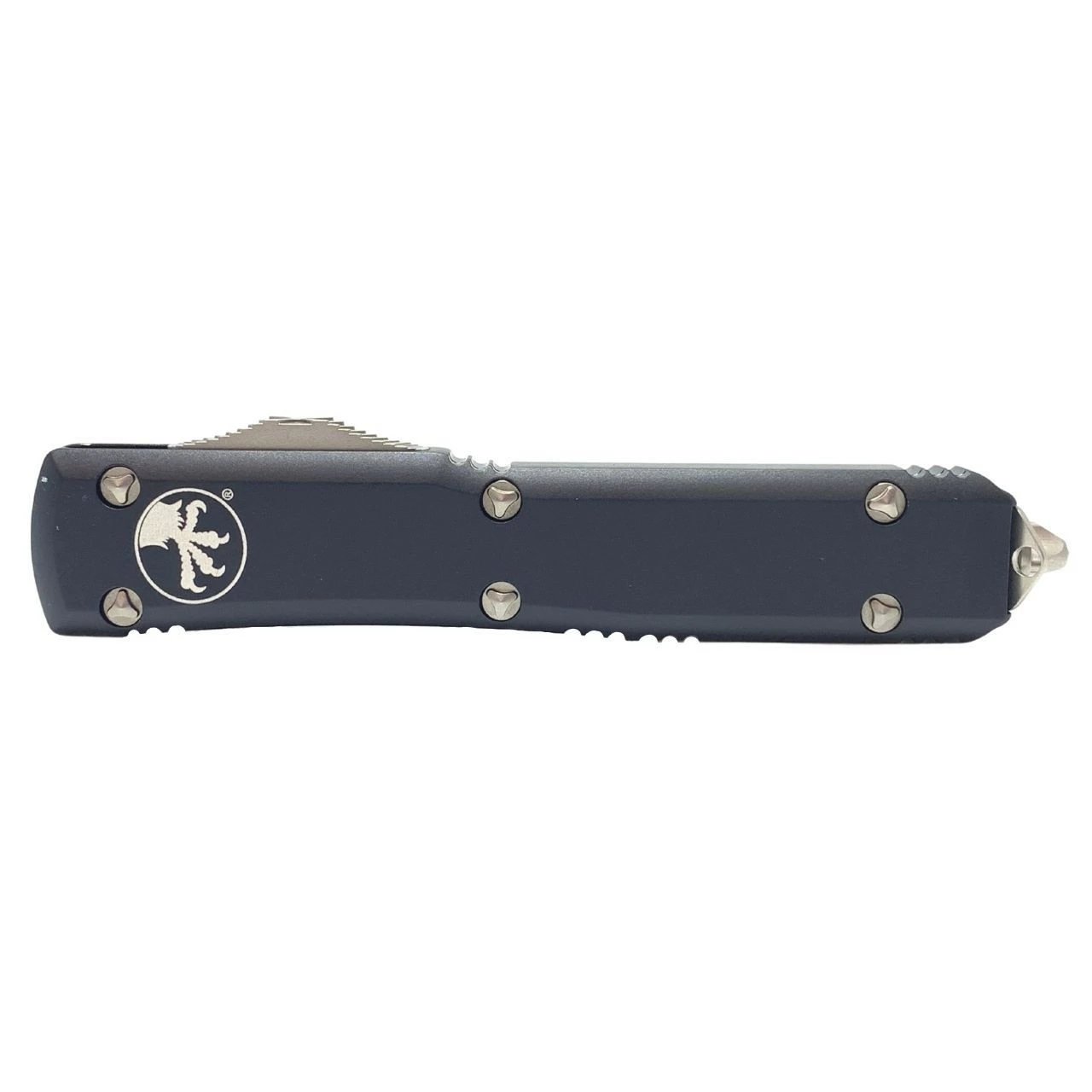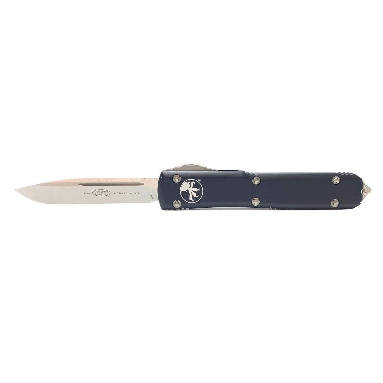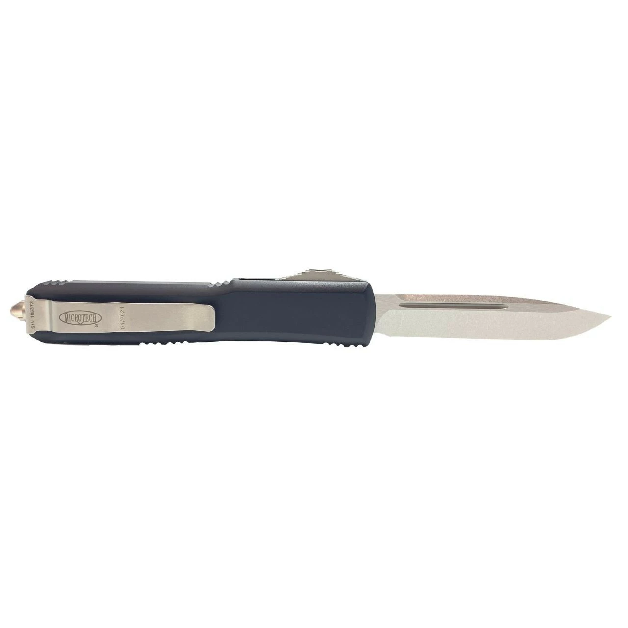 As the flagship model of the Microtech OTF lineup, the Ultratech sets the standard for Out-The-Front technology. Proprietary design allows the firing spring to be at rest in both the open and closed positions, drastically reducing wear on the internal firing mechanisms. The contoured chassis handle provides a lighter and more ergonomic feel and comes in a smooth, flat finish. This Ultratech is equipped with a drop point blade with a stonewash finish and Black aluminum handles. Hardware and pocket clip also feature a stonewashed finish.